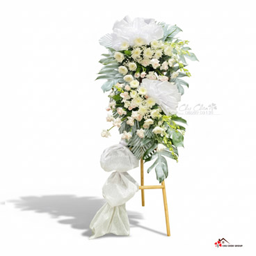 Kệ Hoa là sự lựa chọn ý nghĩa để bày tỏ lòng tiếc thương sâu sắc. Với thiết kế kệ đứng cao ráo, sản phẩm sử dụng tông màu trắng kem và xanh lá bạc (lá Monstera/cọ), tạo nên vẻ ngoài thanh lịch và tôn nghiêm.